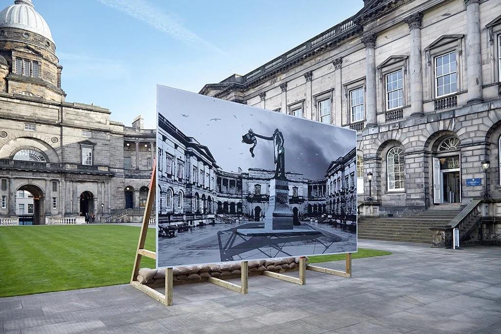 The exhibition title means “memorial garden”, a title shared with the monumental drawing. The latest in a series of large drawings made on flooring vinyl, this work is created through a process Brandes describes as ‘cerebral attic clearance’; a conceptual, organic unfolding of all the ideas preoccupying him to generate an epic multilayered vista. Inscribed with the year “2068” it imagines a future just beyond the artist’s lifetime. Inspired by an unrealised design by Geddes for a garden devoted to the Nine Greek Muses, the central plateau towers over a cityscape made from familiar dwellings. In Brandes memorial garden, Geddes’s celebration of creative inspiration is replaced by a discarded bric-à-brac of broken dreams. This includes a pile of unwanted TVs, a temporary encampment symbolising protest or displacement and the head of the Johann Wolfgang Goethe, suspended above a shut-down sausage kiosk. For the historic Old College Quad, Brandes created a bespoke billboard depicting the surrounding site at a point in the future. He has added the headless statue of Vasily Karazin, founder of Kharkiv University on the hallowed grass, whilst, in an audacious act of digital vandalism erasing the building’s iconic dome and beloved ‘Golden Boy’. The scene is augmented by a statue’s unfeasible long outstretched arm and the inverted Dodo bird hanging from it. The Dodo dangles in an ungainly fashion; of the billions of species lost in the process of evolution it has become an icon of a lost past, as absurd and divisive as the monuments Brandes manipulates.